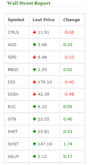 Activity was mostly on the rise, with Audacy, iHeartMedia, Beasley Media Group and Salem Media Group all on the rise as Cumulus Media shed 6 cents, finishing at $11.91.
