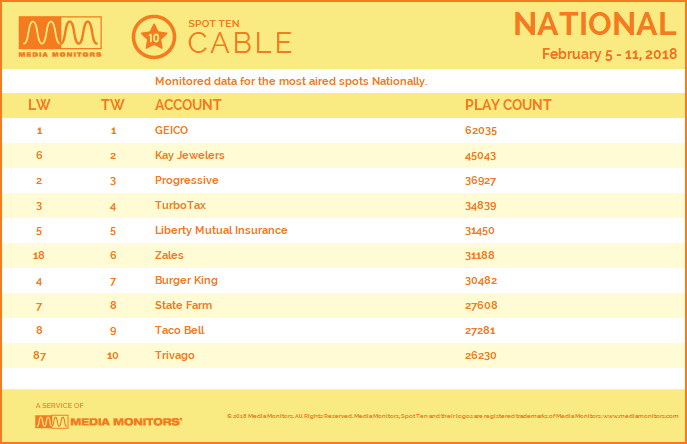 Kay Jewelers and Zales are big brands using spot cable, as seen in the report for the week ending Feb. 11 from Media Monitors.
