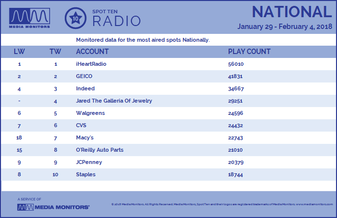 This week, Macy’s and a big auto parts retailer are back on the Media Monitors Spot Ten Radio chart.