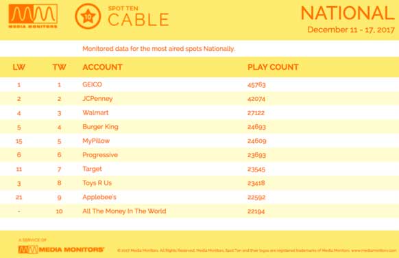 For the week ending Dec. 17, the Scott-directed film All The Money in The World debuted at No. 10 in the report, with 22,194 spots.