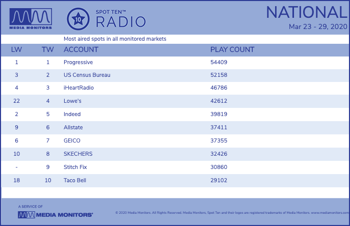 Meanwhile, the play counts for other radio advertisers remains strong — a sign that radio’s resiliency and multiple reports suggesting AM and FM listening is not heavily impact by a severe reduction in in-car listening will soften any Q1 ad weakness.
