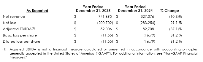 For the year ended December 31, 2025, Cumulus reported net revenue of $741.7 million, a decrease of 10.3% from FY 2024. Its net loss of $200.7 million was lower by 29%, but the Adjusted EBITDA of $52 million declined by more than 37%.