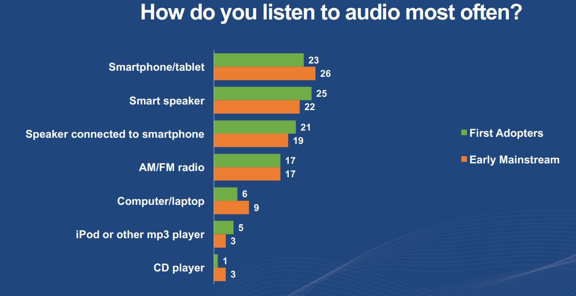 Among the highlights of the just-released report is data showing the smart speaker emerging as the No. 1 way first adopters listen to audio.