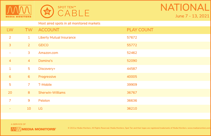 Meanwhile, Amazon.com is fresh on the Spot Ten Cable report with a No. 3 finish as Sherwin-Williams taps into the early summer home renovation period with a bump in spot activity at cable TV.