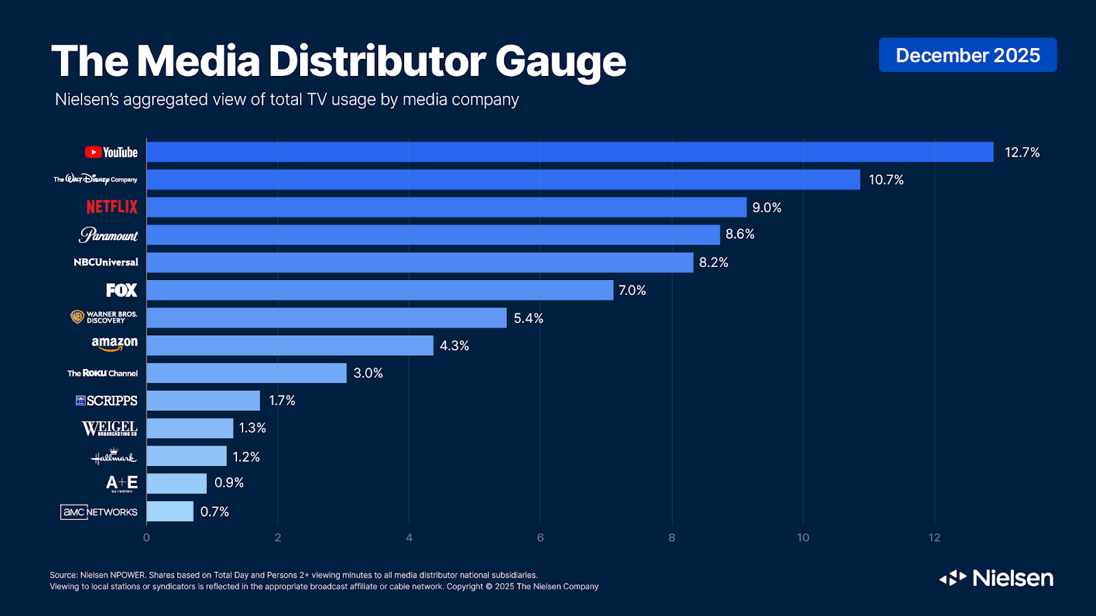 According to Nielsen’s December 2025 Media Distributor Gauge, Disney, Warner Bros. Discovery, Hallmark, Netflix and Amazon all saw notable gains for the month.