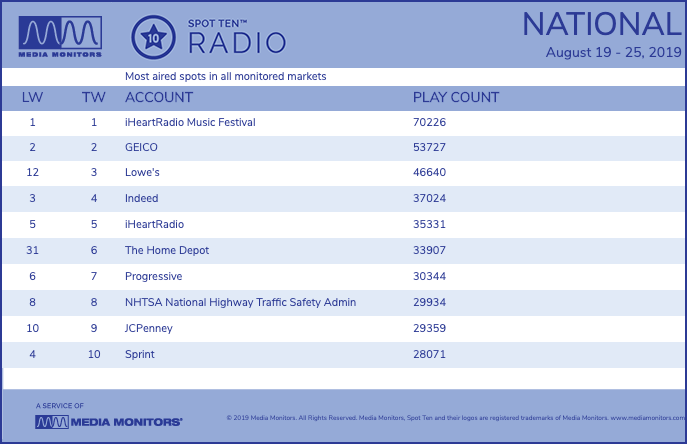 As seen in the latest Spot Ten Radio report from Media Monitors, both Lowe’s and The Home Depot significantly increased their respective number of commercials airing on the stations tracked by the iHeartMedia-owned service.