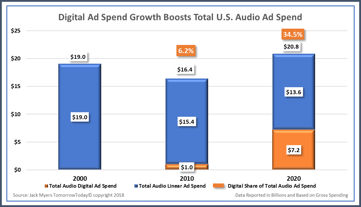 Myers, the noted media ecologist and forecaster who cut his teeth at NYU under noted scholar Neil Postman, forecasts that, by 2020, total U.S. audio ad spend will exceed $20 billion.