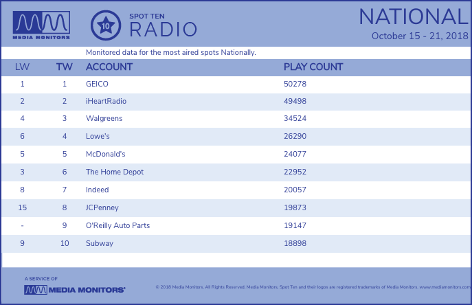 New at No. 9 with a new audio campaign is O’Reilly Auto Parts. The retailer is in the Spot Ten for the week ending October 21 thanks to 19,147 spots.
