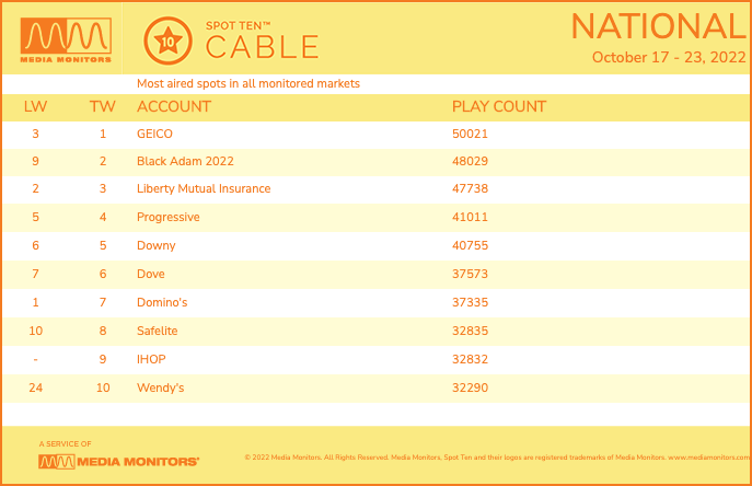 Promotion for the film “Black Adam” was heavy, while a new effort from IHOP pushed the fast-casual chain into the Spot Ten Cable report.
