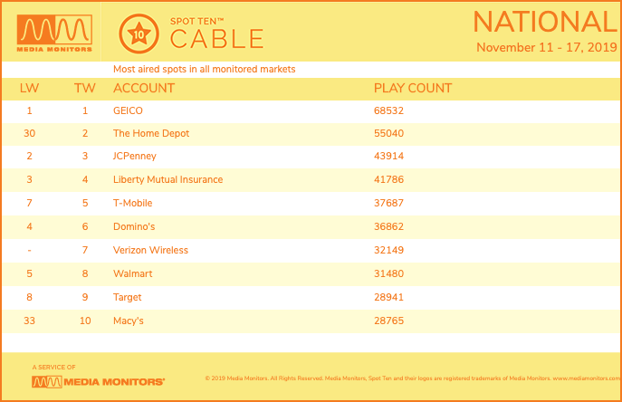 The No. 2 advertiser? It’s The Home Depot, thanks to a resurgence is spot cable activity.