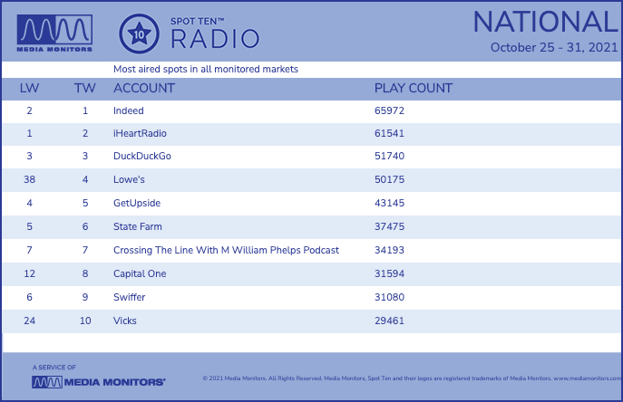 The overall leader: job seeker and hiring site Indeed, which is actively using radio to help attract those looking for employment.