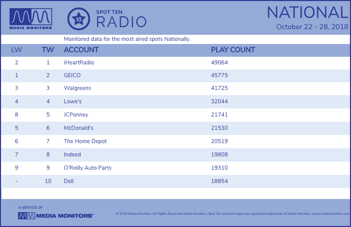 Radio’s top advertisers showed their commitment to the medium once again last week, with little movement on the Media Monitors Spot Ten Radio report for the week ending October 28.