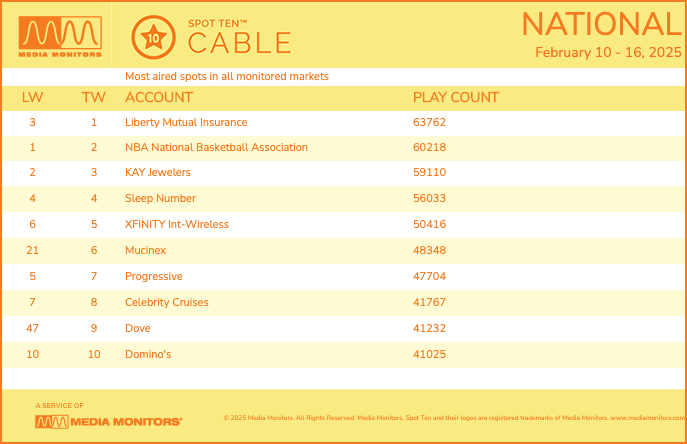 For the week ending February 16, Liberty Mutual Insurance tallied some 63,762 spot plays, according to Media Monitors data.