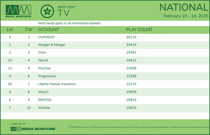 Here, Liberty Mutual Insurance is now No. 7 by spot play count, while pharmaceutical brands Dupixent, Skyrizi and RINVOQ are each present on the latest Spot Ten TV report.
