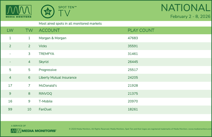 Once again accident attorney specialist Morgan & Morgan is the clear leader as Pharma brands take up three of the slots on the report for the week ending February 8.