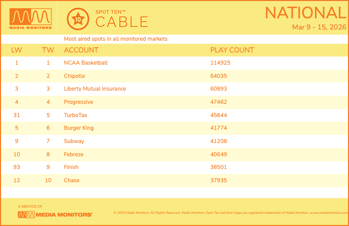The big advertisers remain Liberty Mutual Insurance and Chipotle, as NCAA March Madness has brought an onslaught of promotional spots to cable TV.
