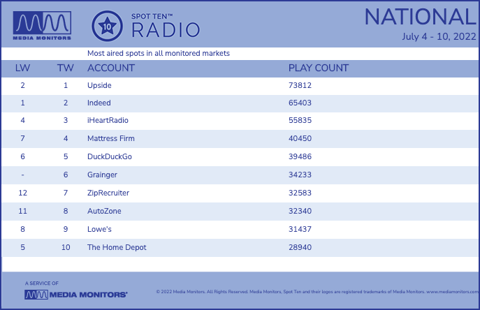 For the week ending July 10, Upside was the top brand at spot radio, with a healthy 73,812 spots aired at the stations monitored by iHeartMedia-owned Media Monitors.