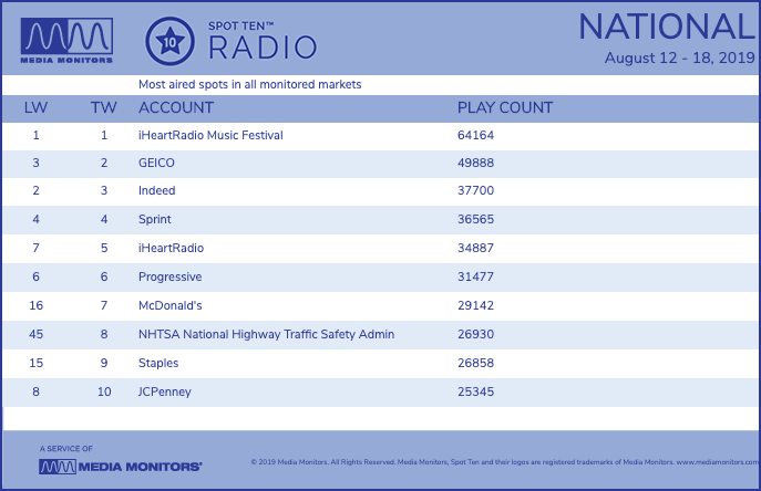According to the latest Media Monitors Spot 10 Radio Report, NHTSA spots saw a surge in play count, putting a new campaign in the top 10 with 26,930 airings.