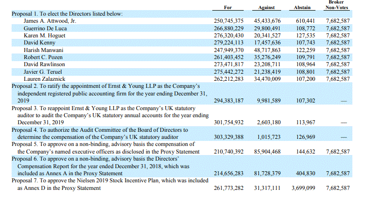 At the annual general meeting of shareholders of Nielsen Holdings plc, held Tuesday, company shareholders approved the Nielsen 2019 Stock Incentive Plan.