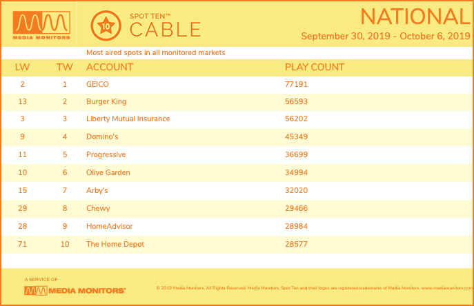 Yes, GEICO is once again at the top of the Media Monitors Spot Ten Cable chart. And, it accomplished the feat with some 77,191 spot plays accounted for during the week ending Oct. 6.