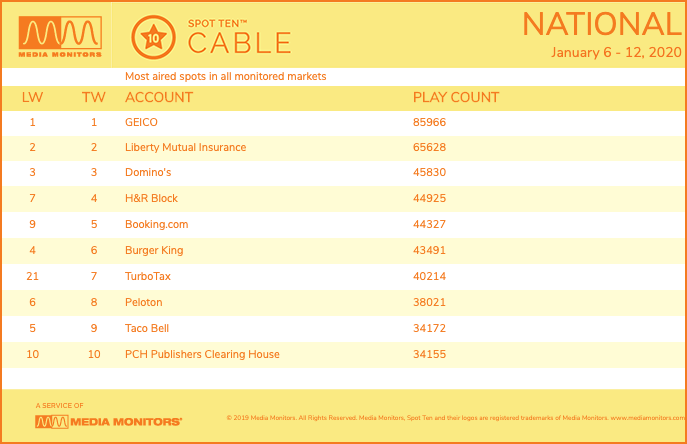 While GEICO totaled nearly 86,000 spot plays for the week ending Jan. 12, the latest Media Monitors Spot Ten Cable report puts LiMu at nearly 66,000 spot plays.