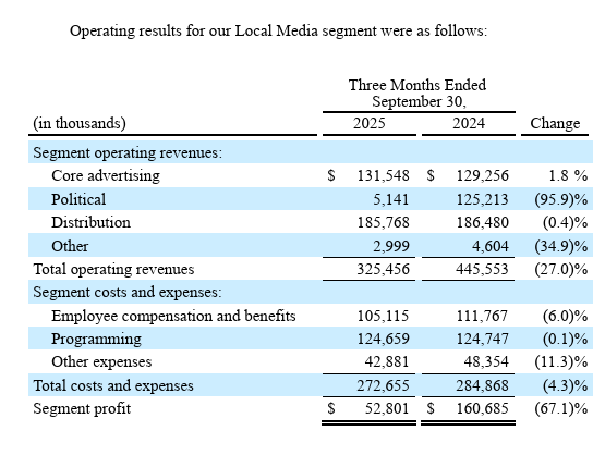 Looking ahead, Scripps believes its Q4 Local Media revenue will be down in the 30% range on flat to low single-digit declines in expenses, due to tough comps tied to 2024 political advertising.