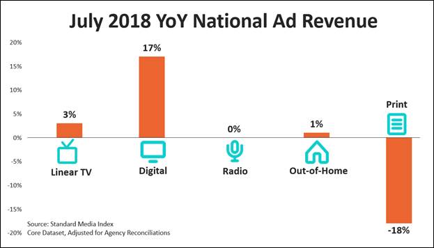 The national advertising market gained 10% year-over-year when factoring out the World Cup in July 2018.