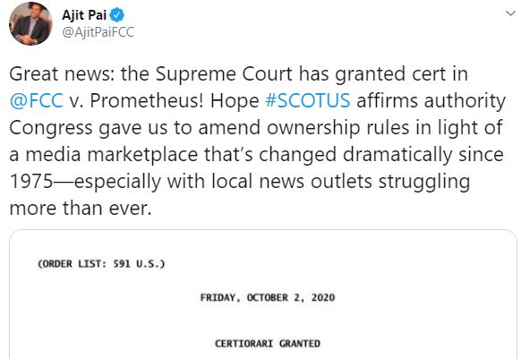 “Hope #SCOTUS affirms authority Congress gave us to amend ownership rules in light of a media marketplace that’s changed dramatically since 1975—especially with local news outlets struggling more than ever,” he wrote.
