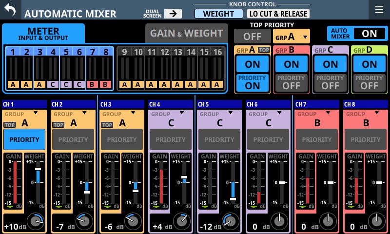 - The new gain-sharing Auto Mixer function automatically controls gain in real time. This ensures optimal conditions at all times for scenarios where multiple participants are speaking including panel discussions, events, and talk shows. Four groups allow up to four different mixes to be created independently for each group.