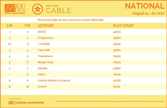Here’s a full look at the top advertisers using cable TV for the week ending August 20, 2017: