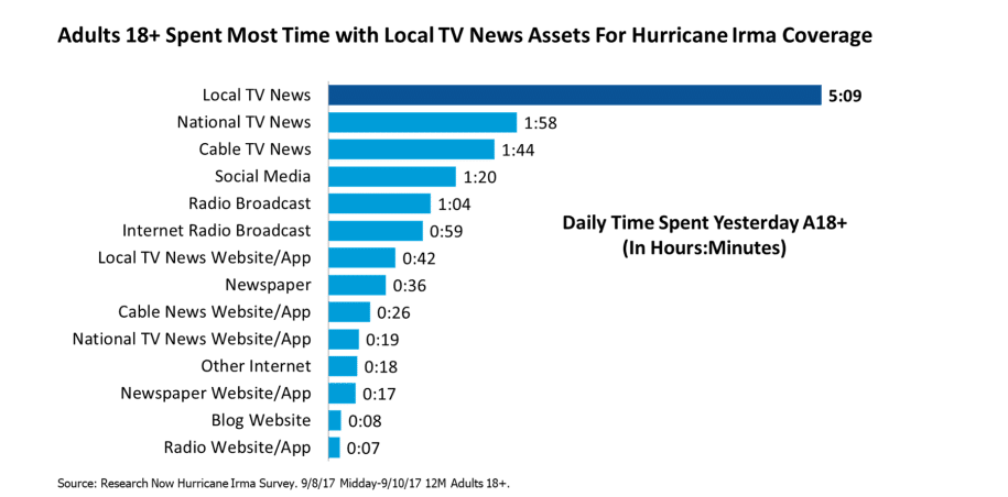 “Live, local broadcast television news connects viewers to their communities and serves as the leading and most reliable source for real-time reporting and lifesaving information in emergencies,” said TVB President/CEO Steve Lanzano. “As Hurricane Irma approached Florida markets, residents overwhelmingly chose their local broadcast TV stations over all other media for storm coverage, with 85% of survey respondents using local TV news for critical information.”