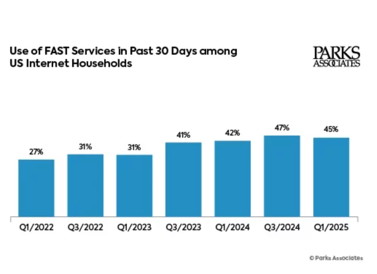 Nearly half of U.S. internet households are consumers of free ad-supported streaming television (FAST) channels, new data released by Parks Associates show.