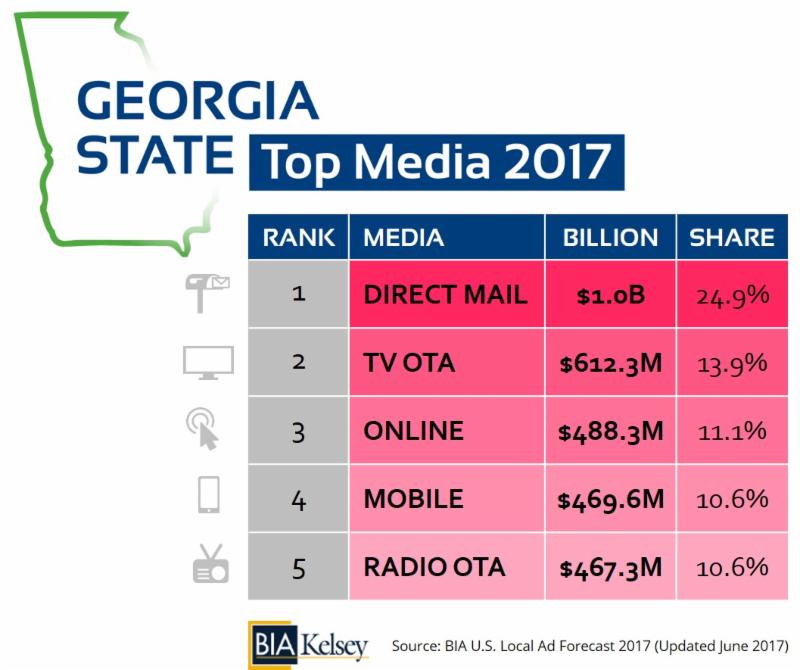 Local advertising spending in the state of Georgia will reach $4.1 billion in 2017 across the state’s six local markets.