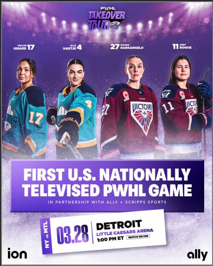 This will see the PWHL Takeover Tour match-up between the New York Sirens and the Montreal Victoire air on ION, with coverage beginning at 1pm Eastern on Saturday, March 28, from Little Caesars Arena in downtown Detroit.